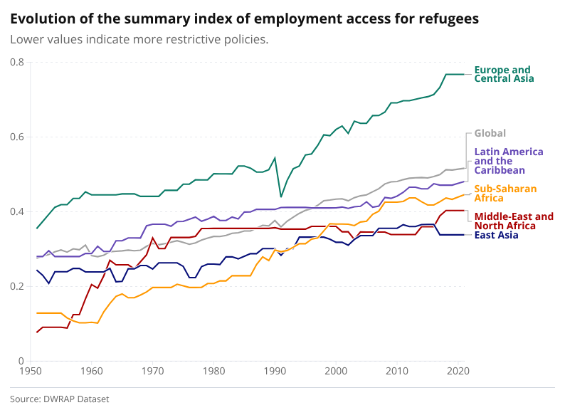 Why tracking policy matters: DWRAP. Understanding which policies enable self-reliance—and under what conditions—is therefore central to sound decision-making. The Dataset of Refugee and Asylum Policy (DWRAP), developed with the support of the JDC, provides a comprehensive overview of de jure asylum and refugee policies across 193 countries from 1951 to 2022. It covers domains such as access to services, livelihood indicators and access to civil rights among others. An interactive platform for exploring trends and cross-country differences accompanies the dataset. By systematically tracking socially and economically inclusive policies, DWRAP can help researchers, practitioners and policymakers benchmark progress and identify replicable, context-appropriate reforms.